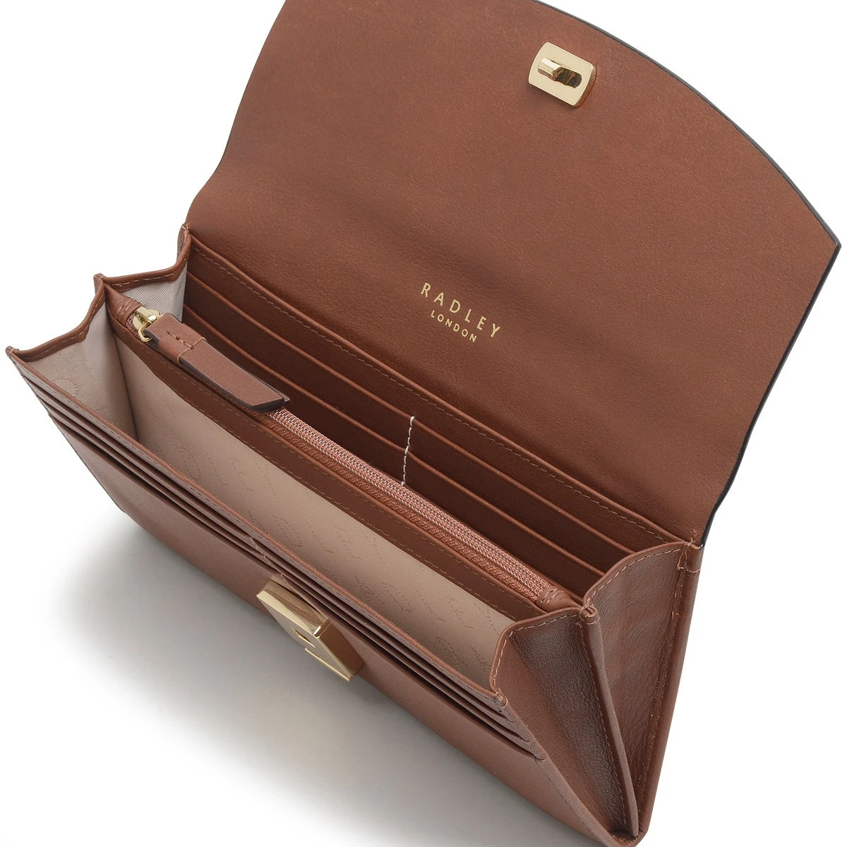 The Apsley Road matinee purse. Where it’s not about all the bells and whistles. Just pure sophistication and expert craftsmanship. We can’t boast enough about the leather. It’s soft, premium and natural. With beautiful cut edges. It’s the type that’ll look just as good in ten years’ time. Yes, even after a decade of storing your cards and cash. The fact that it matches with any handbag is an added bonus: Crafted with premium veg tanned natural leather , Cut edge detailing , Flapover shape with peekaboo push lock , 12 internal card slots, Two internal note compartments, Central zipped coin pocket, Zipped pocket to back, Foil embossed Radley London logo , Detachable Scottie dog key fob , Comes with a Radley London dust bag