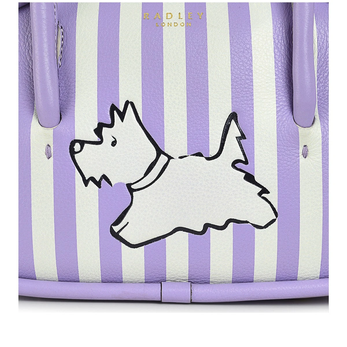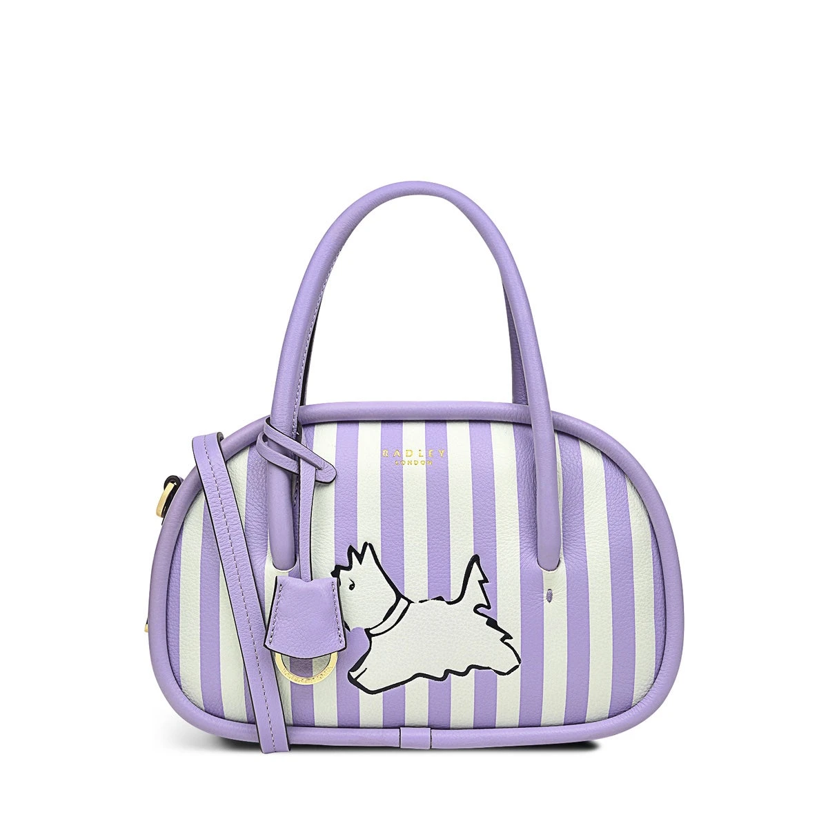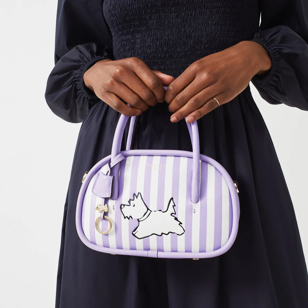 A bowling bag but make it artisan crafted. That would be Bexley Street Cabana, a striped, retro, rounded shape in fine-grain leather. Designed with handy features like tubular handles and a detachable strap. But the chunky edge piping and embossed Scottie? Those were just for fun.