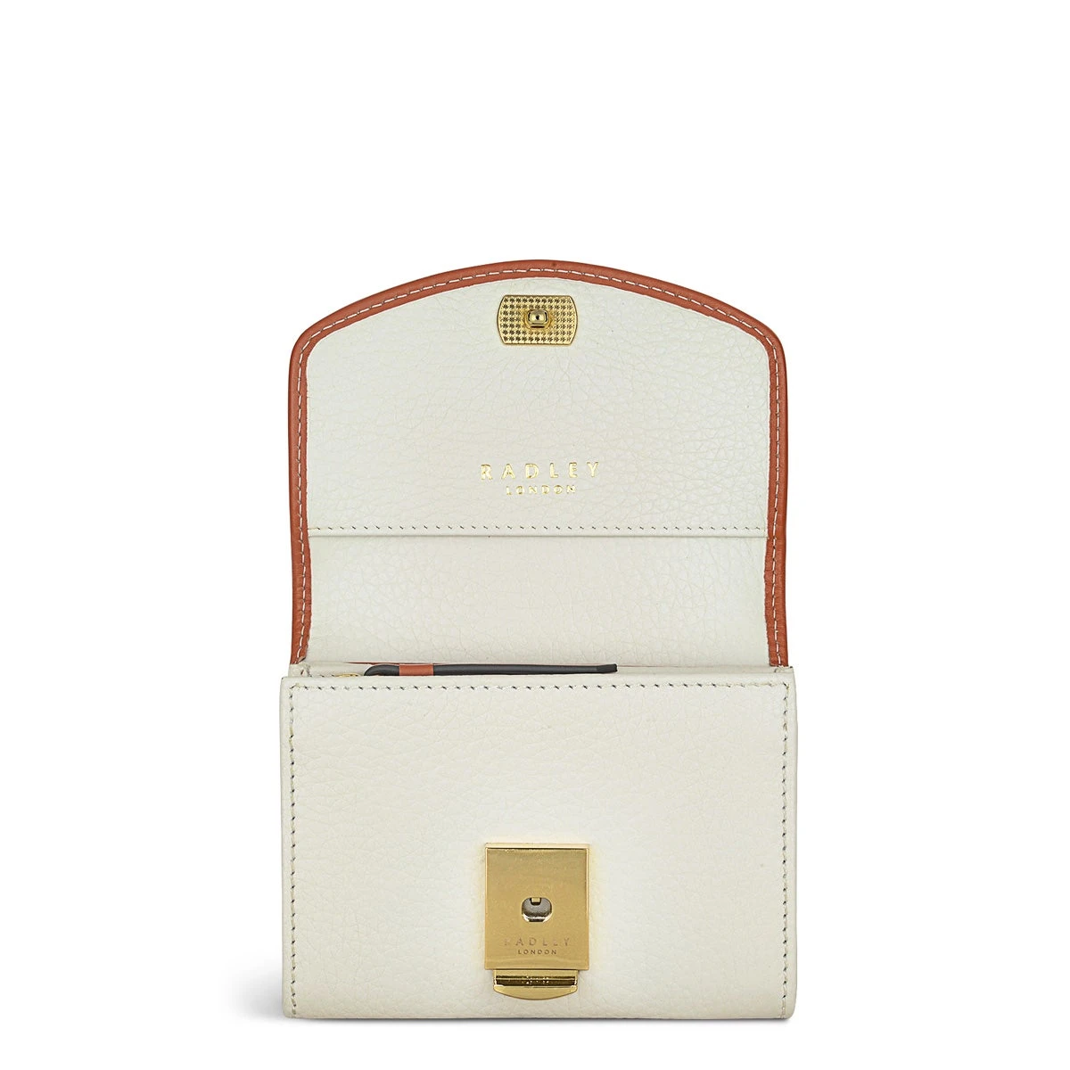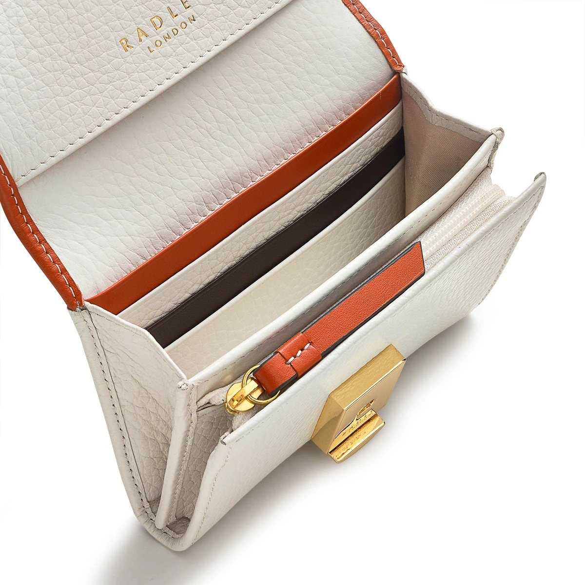 The name will give it away. But so will the neatly bound, curved flap with hidden push-lock hardware. This purse is inspired by our Cording Street bag and is made to match with a few of the same signature features. A preppy edition, its crafted in a combination of soft grain and smooth leathers with contrast trims and edge stitching, and our smart metal Heirloom emblem.
