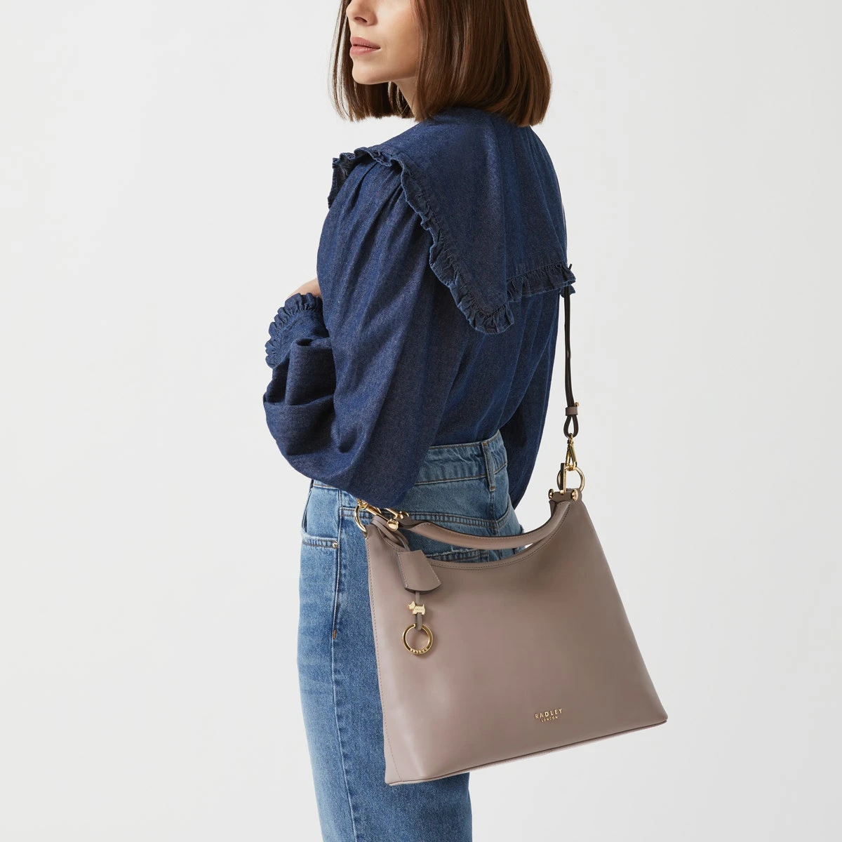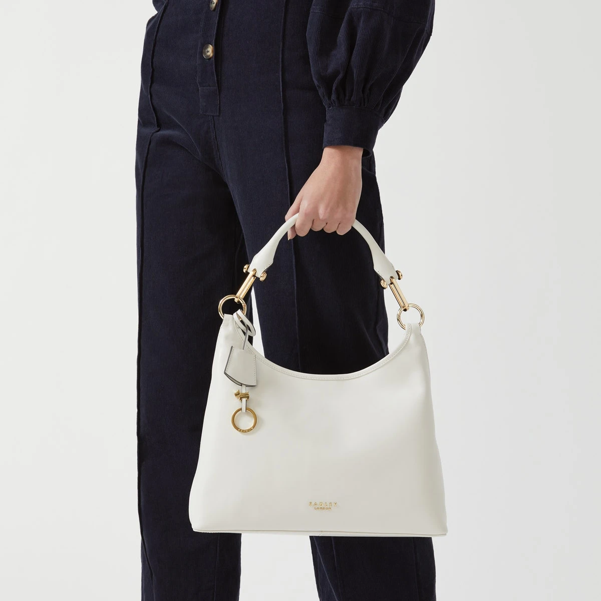 Like the Cuba Street bag you already know. With the same highshine hardware. Now just a little smaller. And smarter. With a more structured shape in veg tanned leather. The new Cuba Street is the style you want on your arm at your next bottomless brunch. But you can also wear it handsfree because we’ve also added a handy detachable cross body strap. You’re welcome: Crafted in veg tanned leather , Leather handle with looping highshine hardware , Detachable cross body strap , Curved top , Chevron fabric lining, Internal zip and slip pockets , Metal Radley London logo lettering , Detachable Scottie dog key fob , Comes with a Radley London dust bag