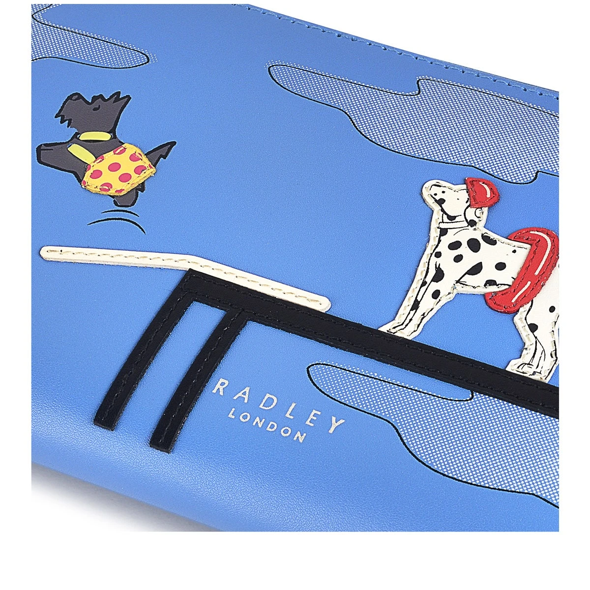 Making a splash. That’s what our Scottie is up to on the Diving Board continental wallet, along with two of his four-legged friends. See them playing in leather applique and screen prints on the front of this spacious style. Complete with a silver zip and branded puller that will keep your items secure inside.