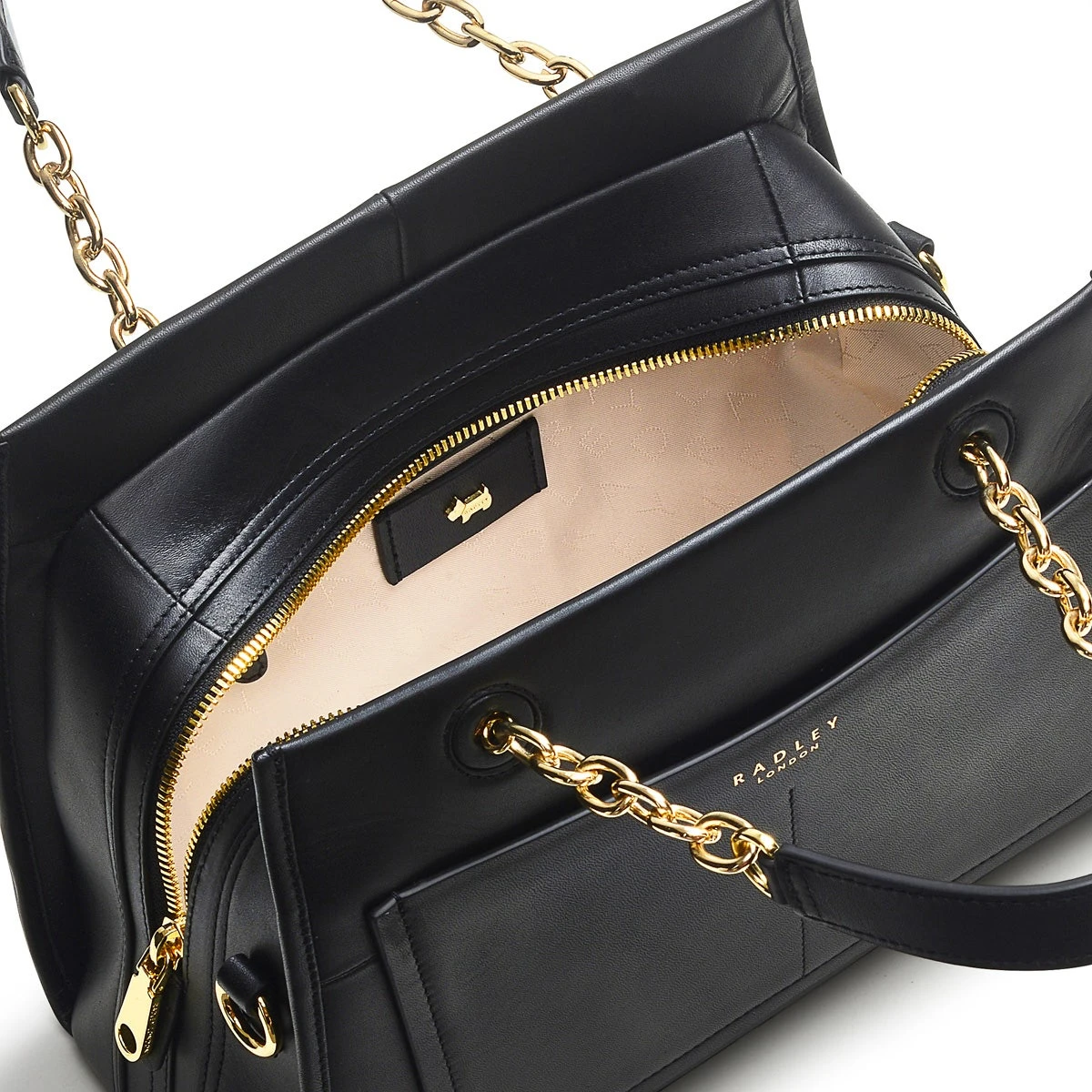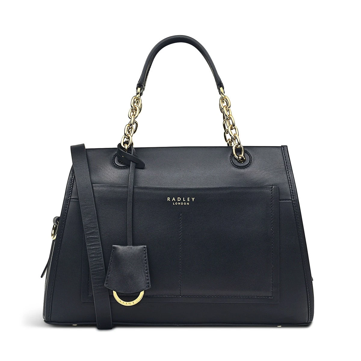 We know what you’re thinking. The Fern Street multiway bag looks smart and sophisticated. It’s all down to the shiny chain handles and the thick, flat, natural leather. Which makes this style feel just as premium as it looks. Then there’s the cut-edge front pocket. As it’s the perfect size for your cardholder, it’ll come in very handy when rushing between coffee shop counter and train station platform: Crafted in natural, flat leather, Chain and leather grab handles and shoulder straps, Straps thread through leather eyelets , Cut edge front slip pockets with sewn edge trims, Side gussets with layered leather channel details, Central zip fastening with branded metal pullers, Jacquard fabric lining , Internal zip and slip pockets , Foil embossed Radley London logo, Detachable Scottie dog key fob, Comes with a Radley London dust bag