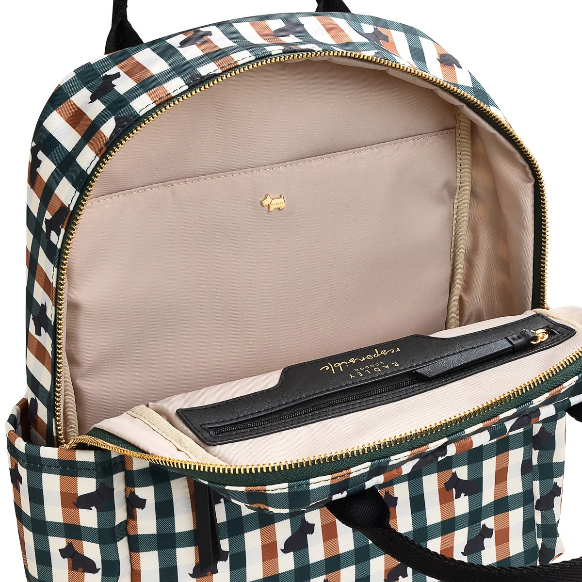 Our favoured Checked Dog print meets a new-season colour combination. Enjoy this updated signature design across all our signature Finsbury Park shapes, including the medium backpack. With adjustable webbing straps, lots of pockets and room for a laptop, it’s spacious and practical too. And part of the Radley Responsible range in recycled polyester (made from plastic bottles) and water-based PU.