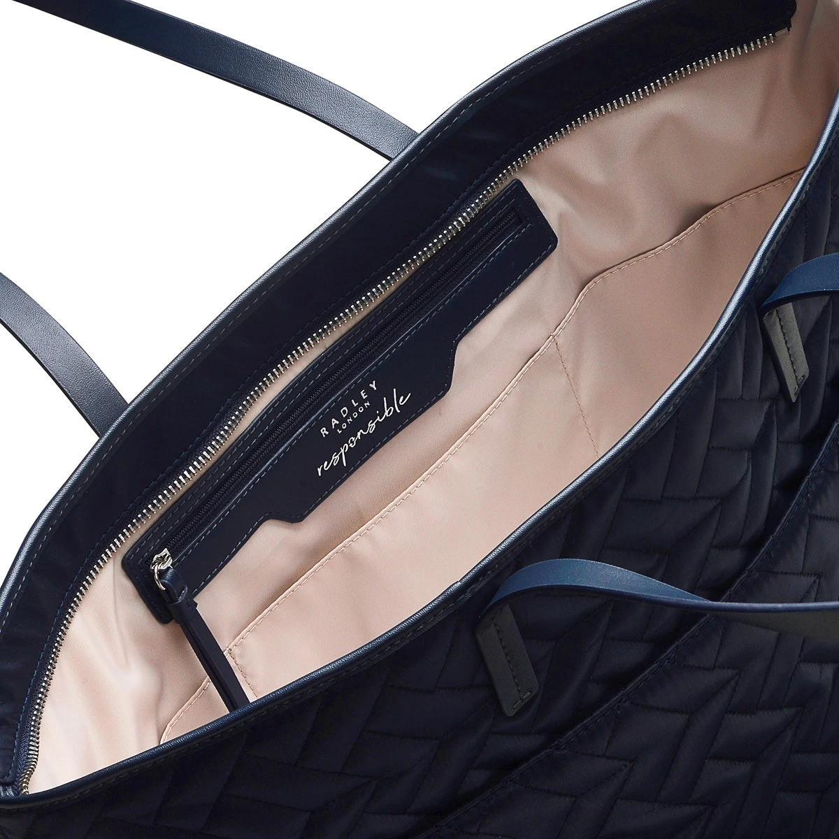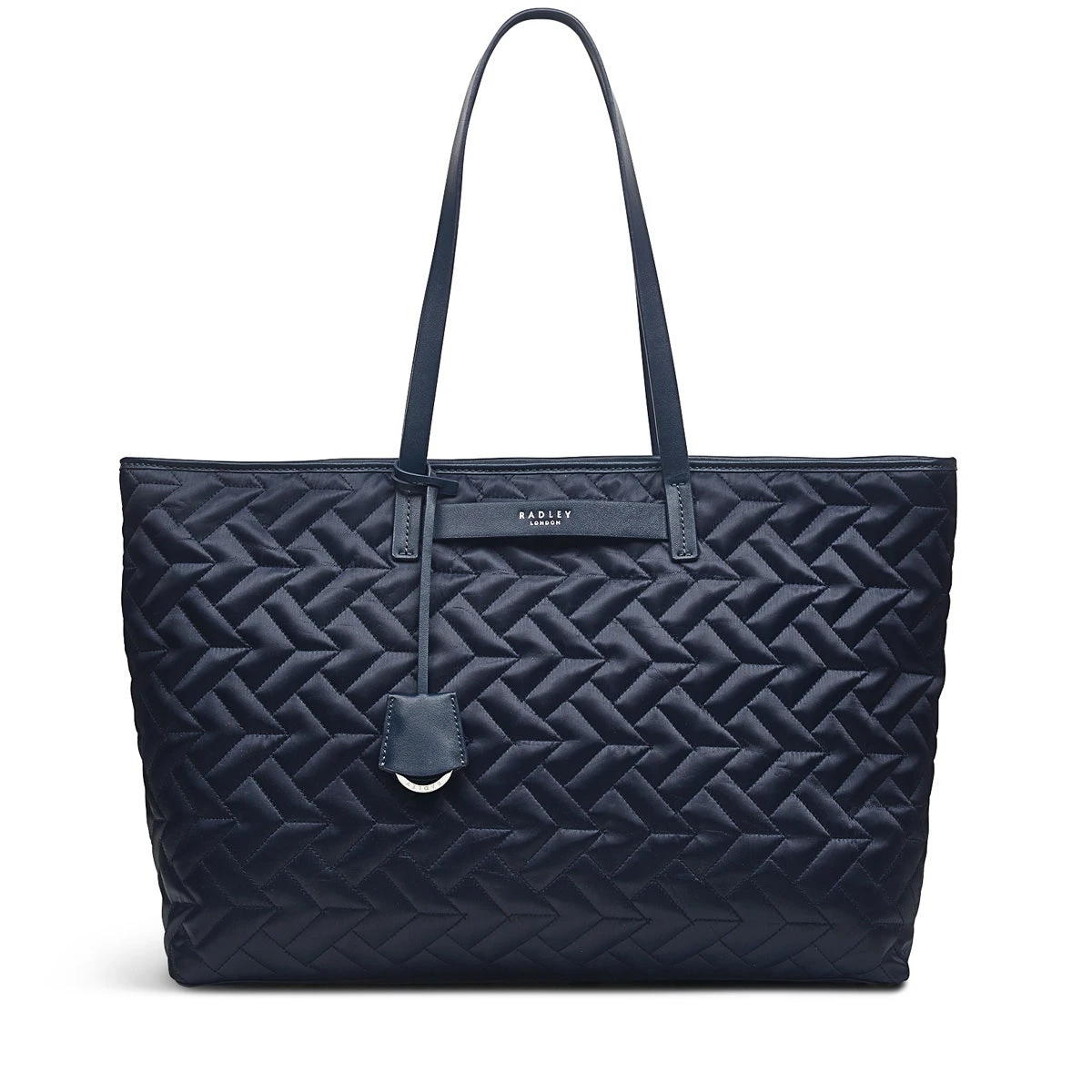 We know you’ll recognise the Finsbury Park Quilt large shoulder bag. It’s a familiar favourite for those who like having a lightweight fabric bag for their commute. Made with recycled polyester, we’re excited to say it’s part of our Radley Responsible range. That means, while it comes in our new Ink shade, it’s actually pretty green: Crafted with recycled polyester (made from plastic bottles), Contrast water-based PU trims, Radley Geo quilting, Twin shoulder straps , Zip-top fastening with branded zip hardware, Recycled fabric lining, Internal sleeve fits 15″ laptop, Internal zip and slip pockets , Slip pocket to back, Foil print Radley London logo, Detachable Radley London key fob, Part of the Radley Responsible range