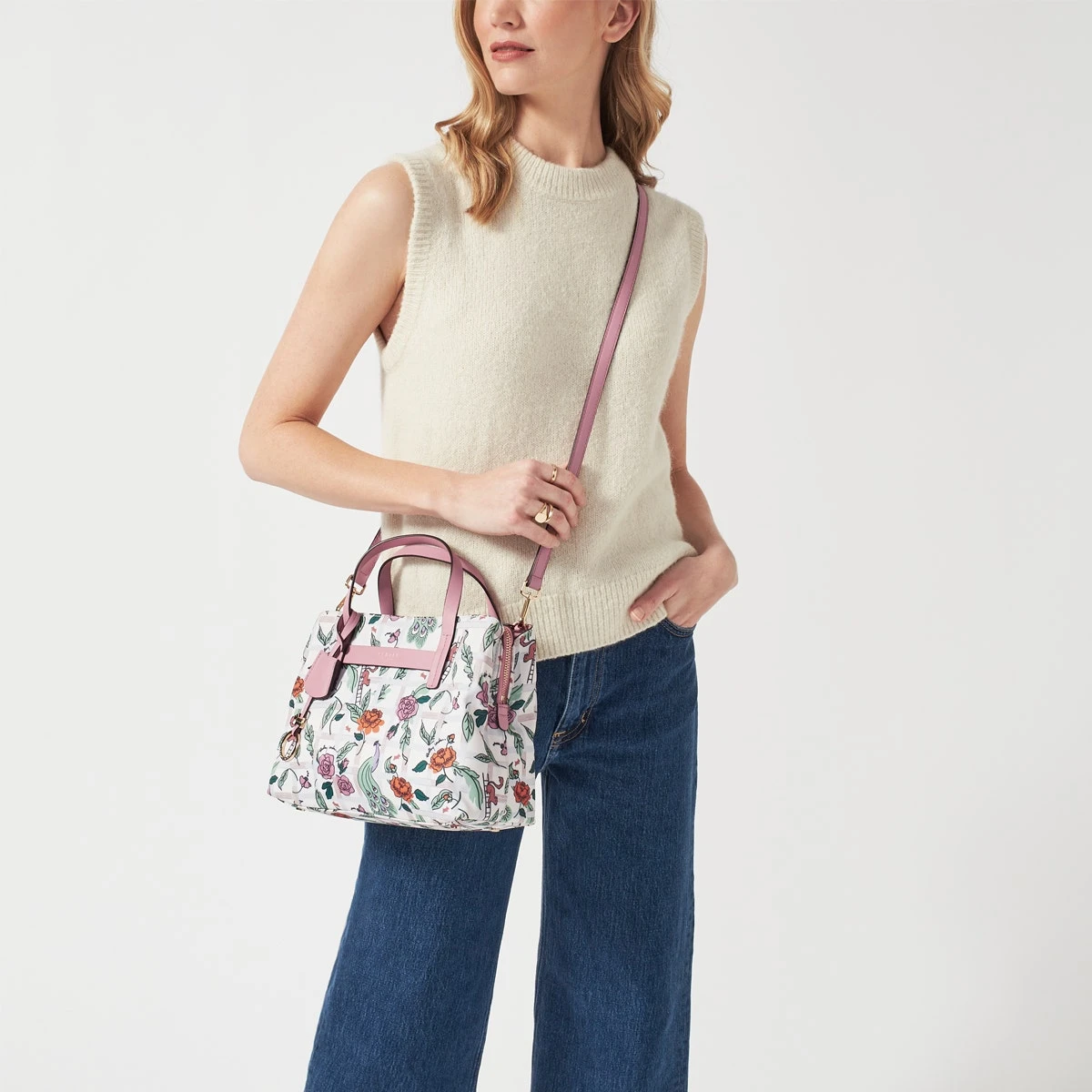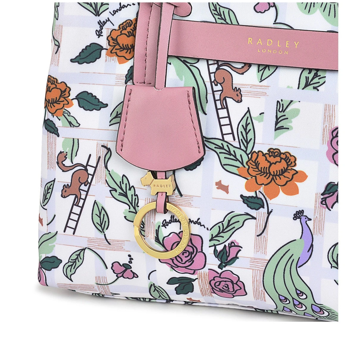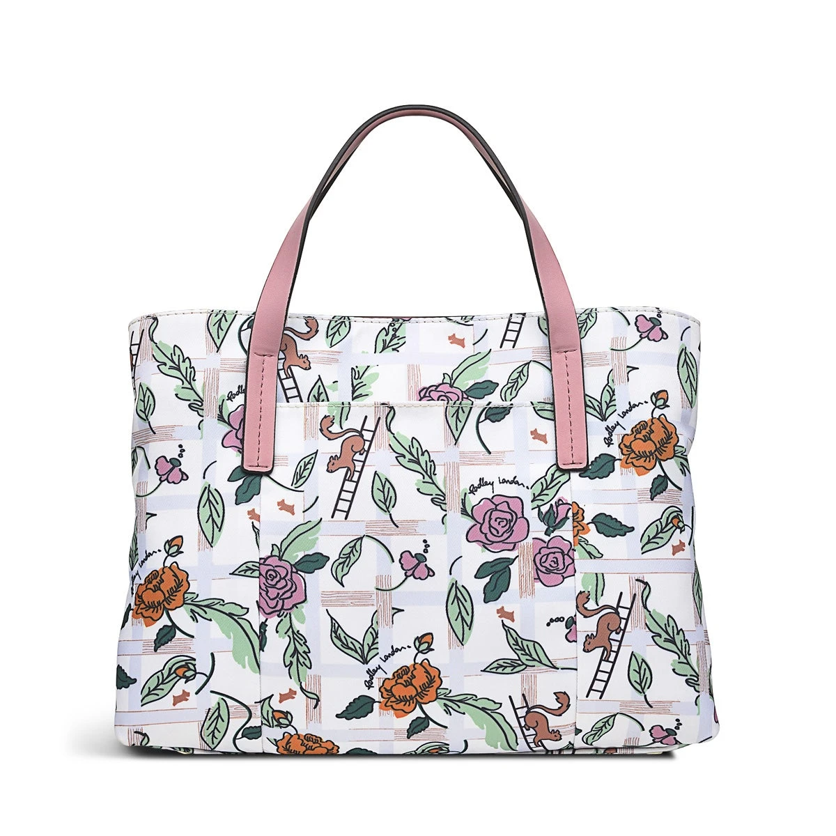 Our prettiest edition yet. The Finsbury Park Regents Rose collection is printed with a floral trellis illustration. As always, our signature multiway bag (complete with its three interior sections) is crafted using recycled polyester made from plastic bottles, with pretty-in-pink trims.