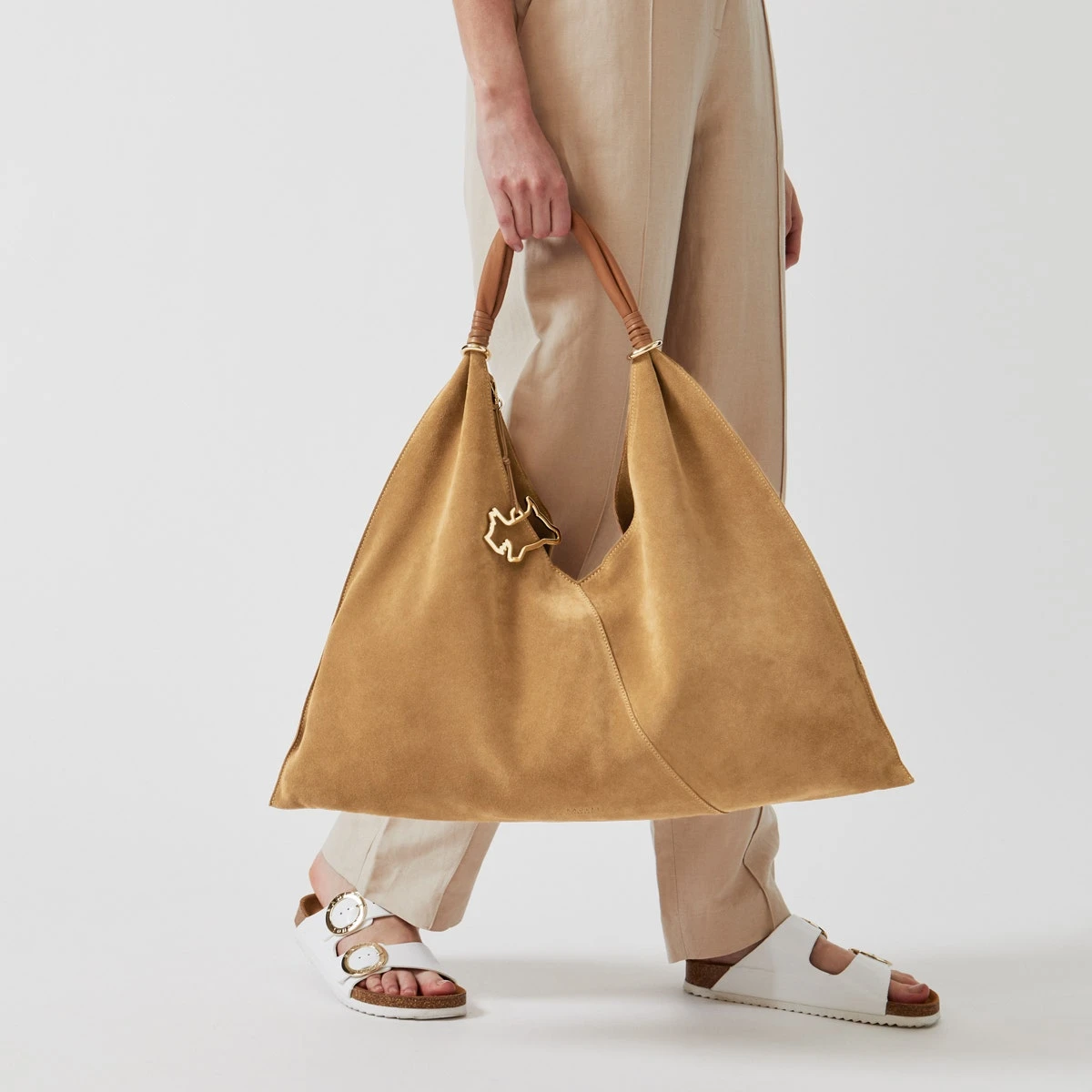 You might recognise this name because we’re adding to the Green Lane collection with another slouchy shape. This time, a triangular-shaped bag crafted in sumptuous vegetable-dyed suede. And there’s a few luxury details we need to talk about. The external edge seams and micro stitching for one. Then there’s the gathered handle in contrast grained leather. With chunky Scottie dog hardware too, this bag is irresistible.