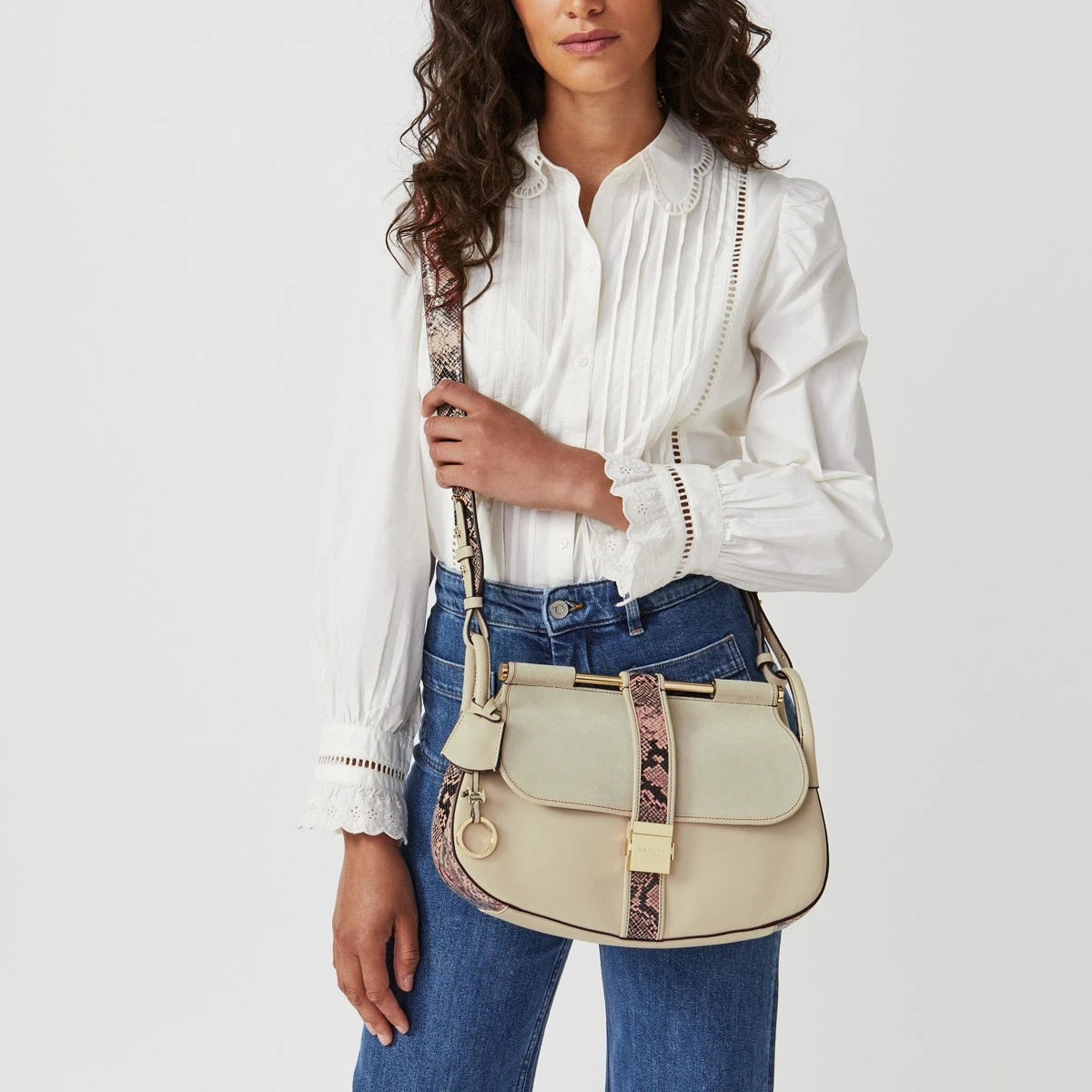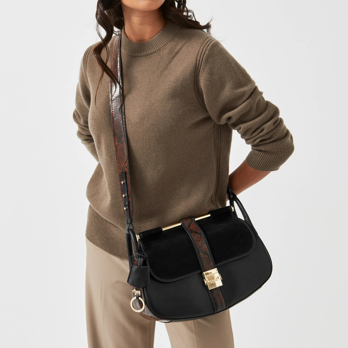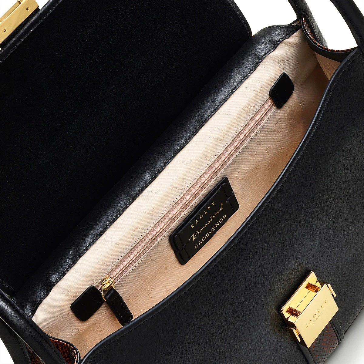After bringing it out the archives, we gave our signature Grosvenor Remastered bag a fresh look with a push-lock fastening and metal bar hardware. And for this latest edition, we’ve added new leathers too, in the faux snakeskin textured trim on the tab and a soft suede flap. Loved for over a decade, this style is ready to be your favourite for another 10 years.