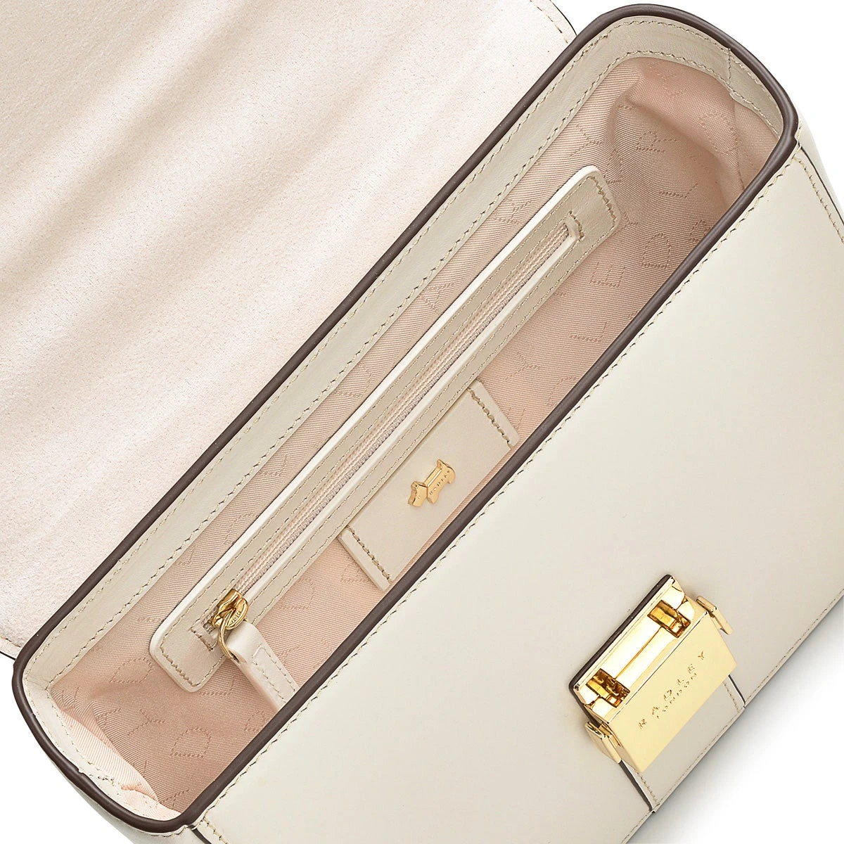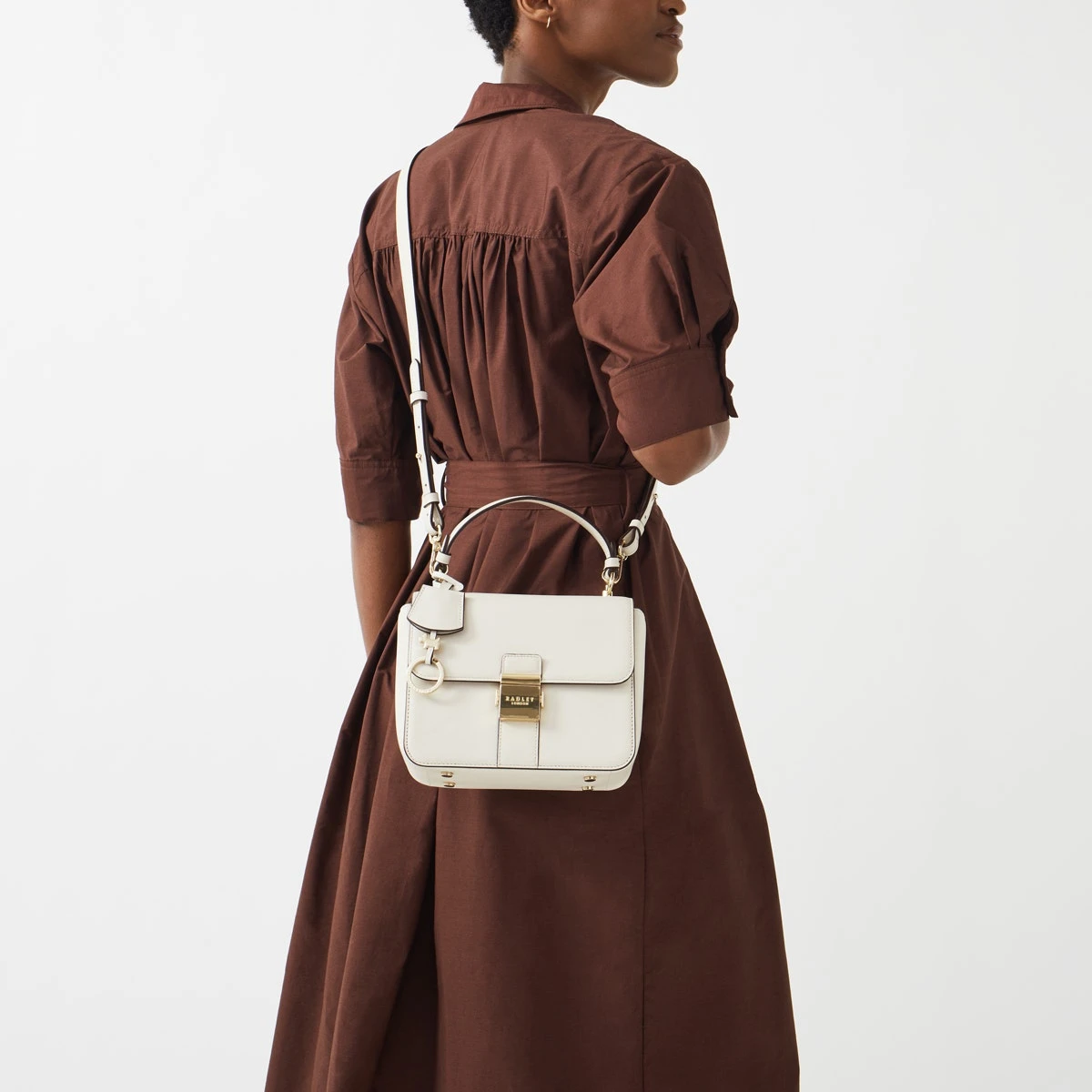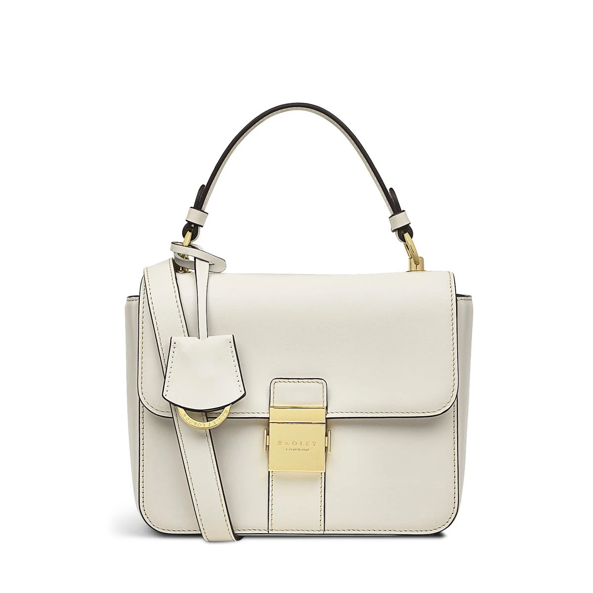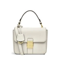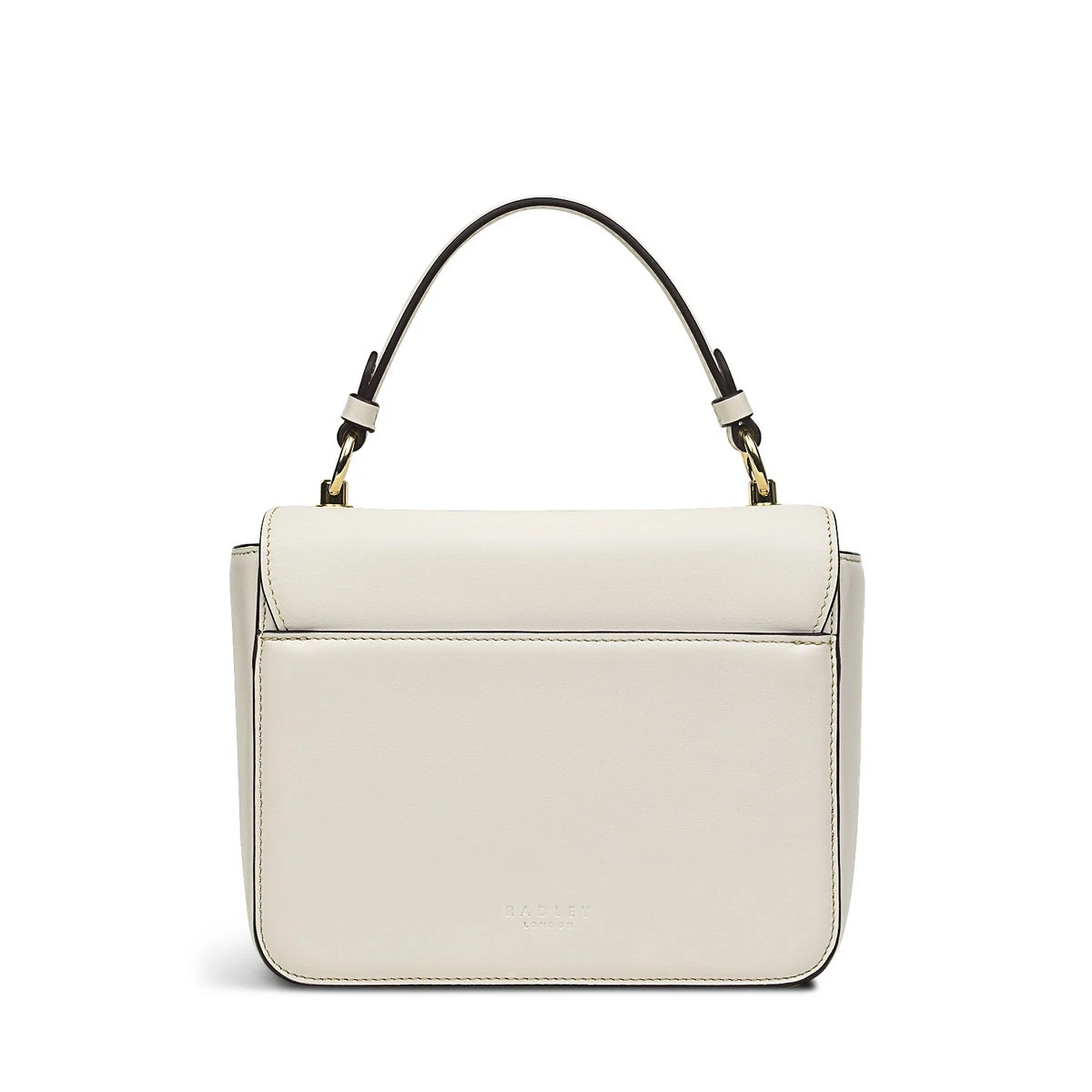 Thinking outside the box. And making it look great in smooth leather with gold-tone hardware. This chunky shape is our Hanley Close grab bag. A boxy addition to the collection that features the same cut edge handles, branded push lock and blind embossed logo on the back.