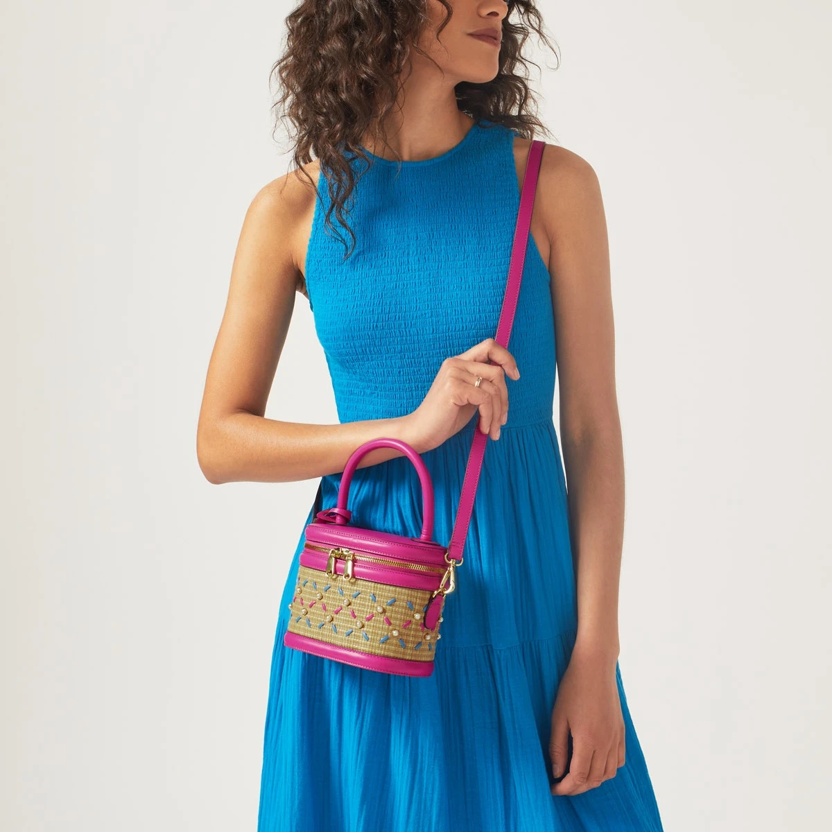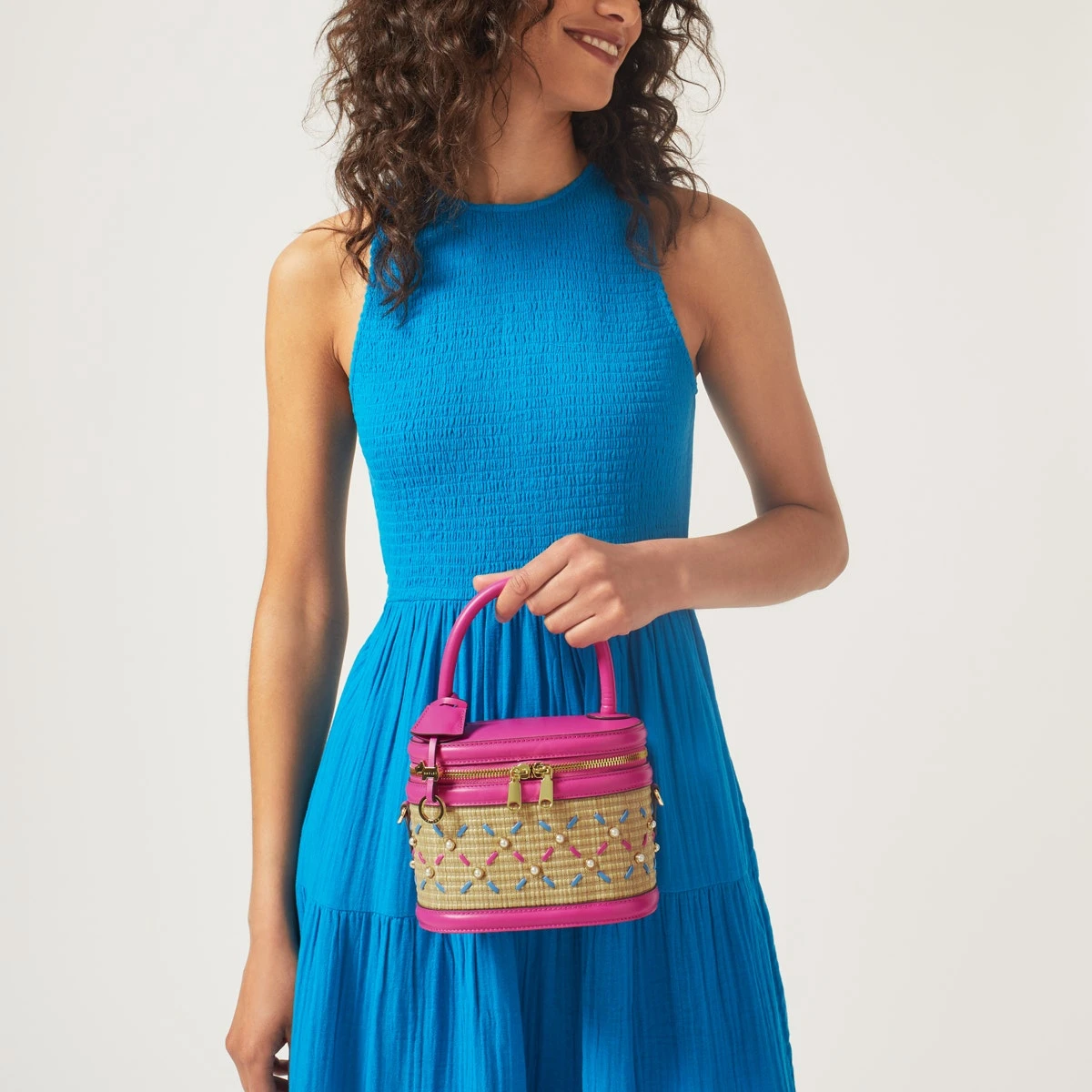 Made for beauty. Our Harriet Street bag is inspired by the vintage vanity cases used to hold make-up. Our interpretation, this top-handle style is combines leather and raffia-style weaving, with leather hand-stitching and mini pearl studs. So pretty, it deserves its own seat at the table during dinner reservations.