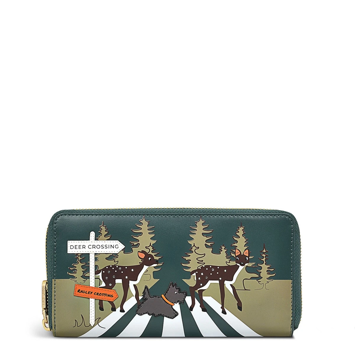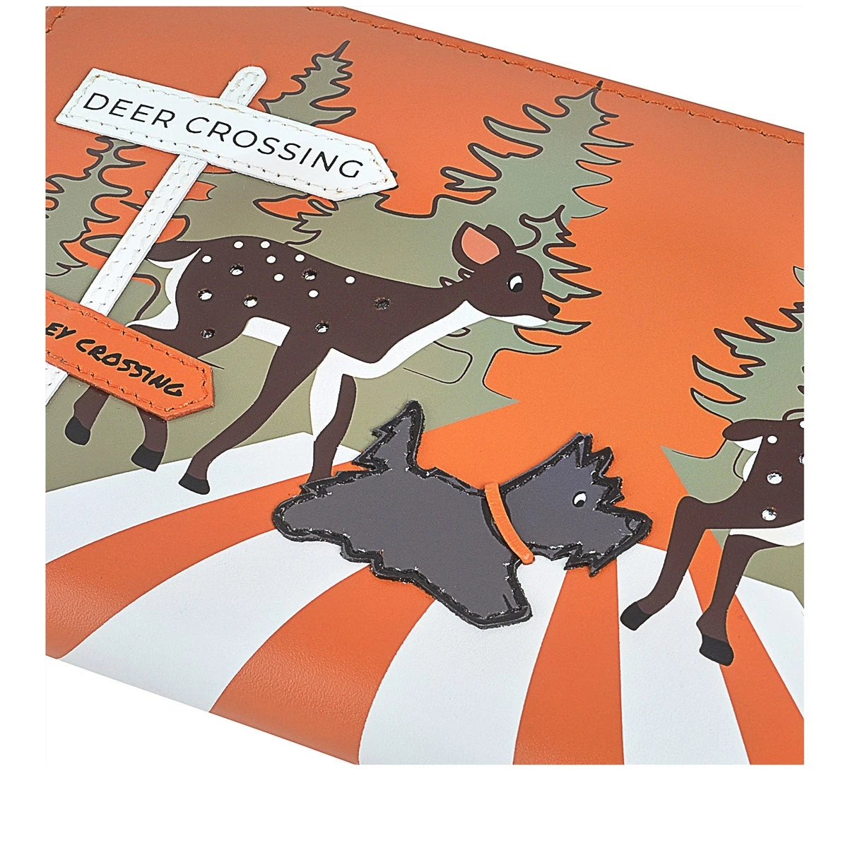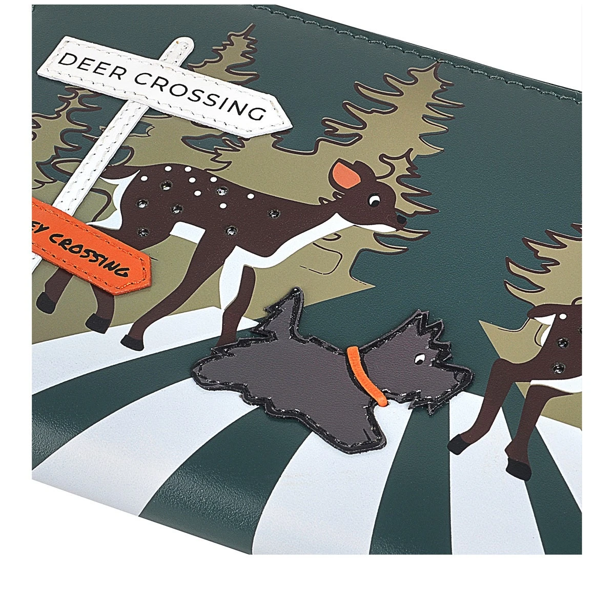 Making friends wherever he goes, Radley dog has met some deer in the park on his latest adventure. Meet the new characters, who glisten with mini diamanté details and see them explore on the Hello Deer large matinee purse. This charming scene is printed on smooth leather with ‘deer crossing’ appliqué. (You’ll see our cheeky Scottie has pinned up his own sign too.)