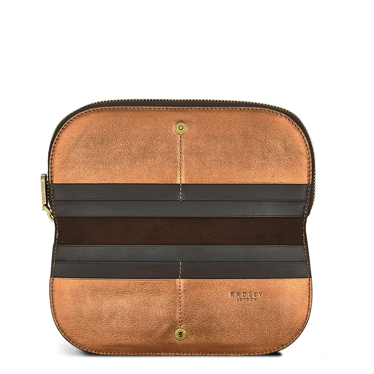 If there’s one thing our iconic Liverpool Street 2.0 bag deserves, it’s a matching purse. One that shares its same curved shape and painted cut edges. Just like this large bifold style, now in metallic bronze leather. With internal card slots and branded zip-pull hardware, you can rely on it to keep your cash safe (and to always coordinate with your favourite handbag).