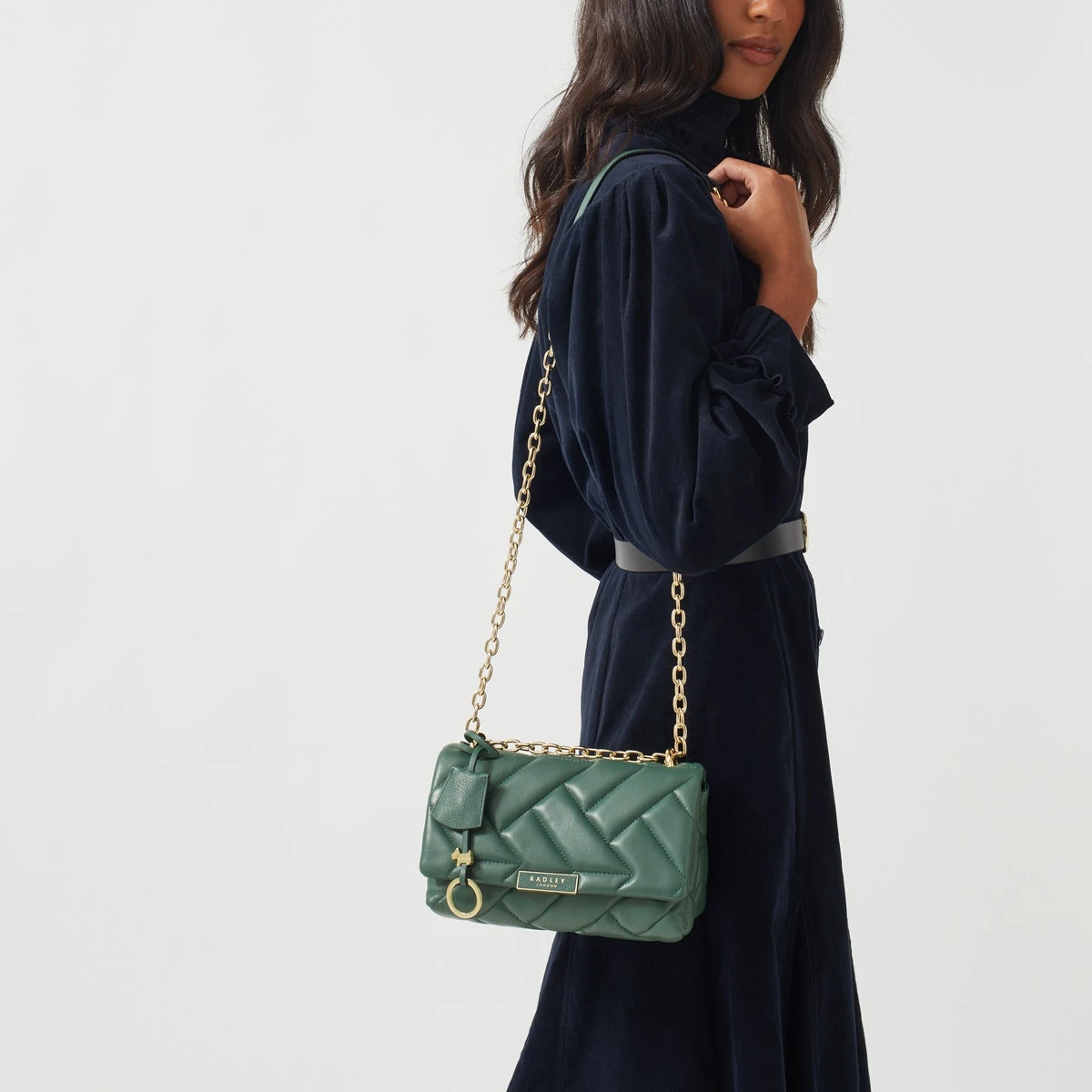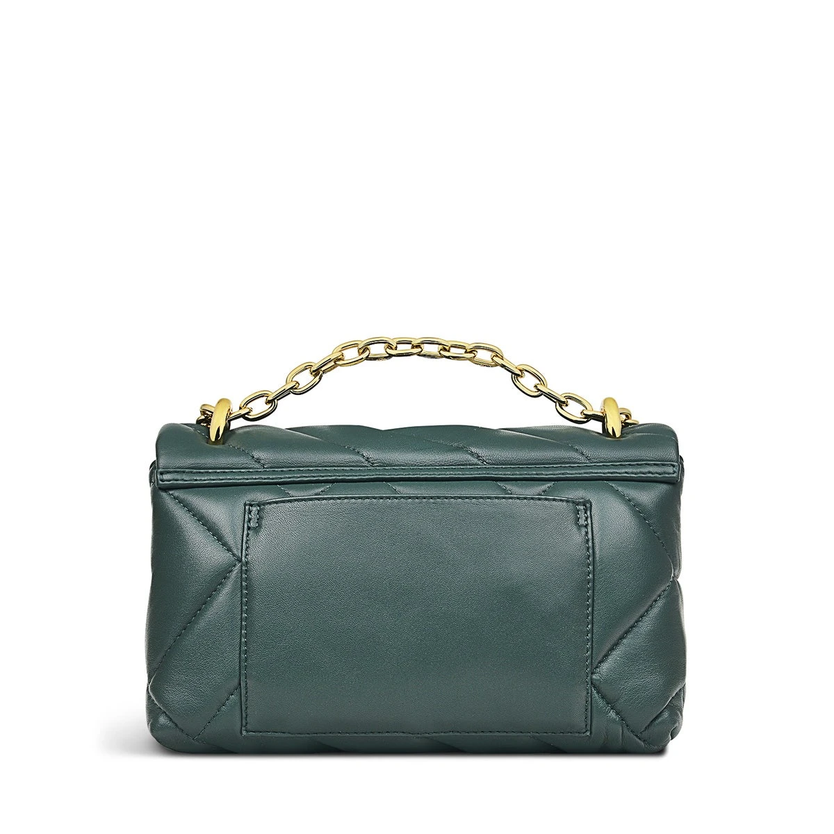 Mill Bay. Where day-to-night glamour meets premium, natural leather. And this edition of our flapover bag is crafted with exaggerated quilting for even more puffiness. Soft and squishable in lamb nappa leather with the same sliding chain and leather strap, which means you can wear it two ways: Keep it long and carry it cross body or double it up to tuck the bag under your arm.