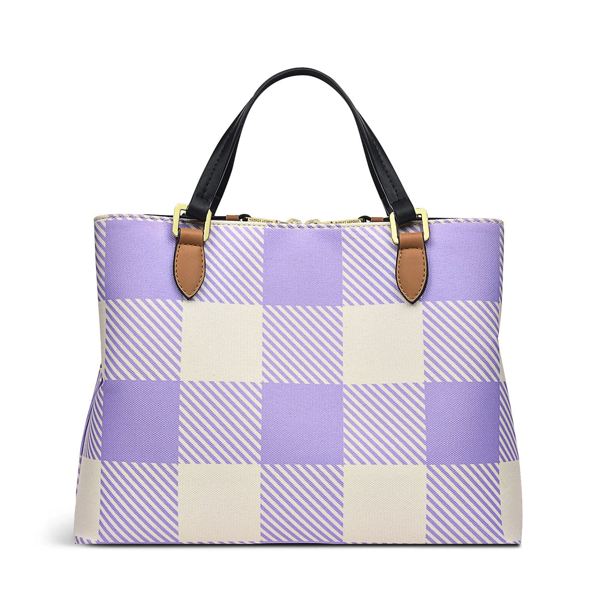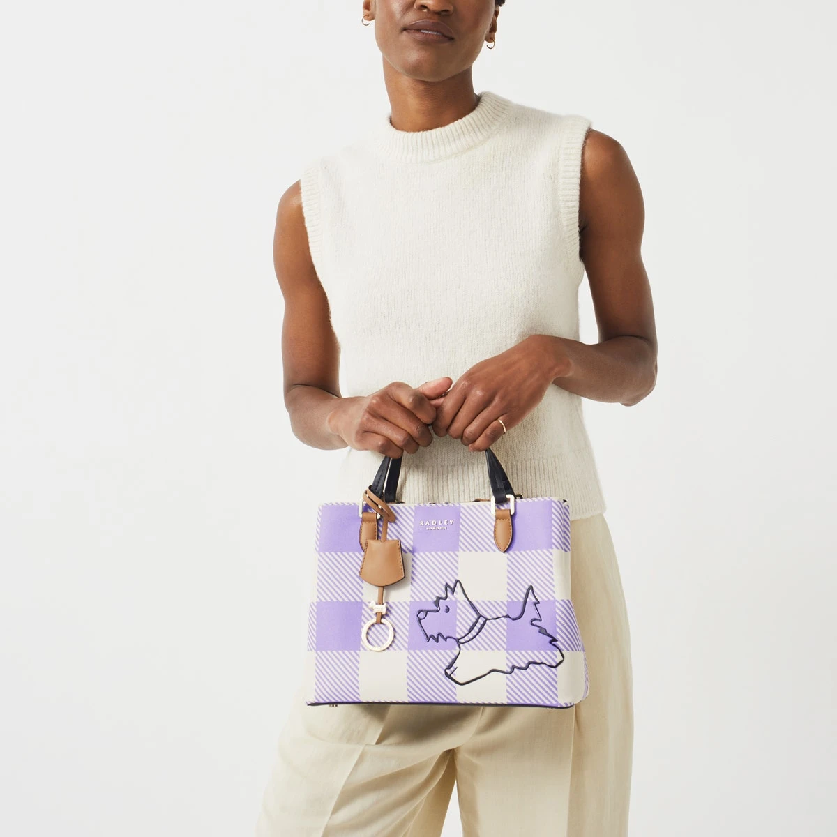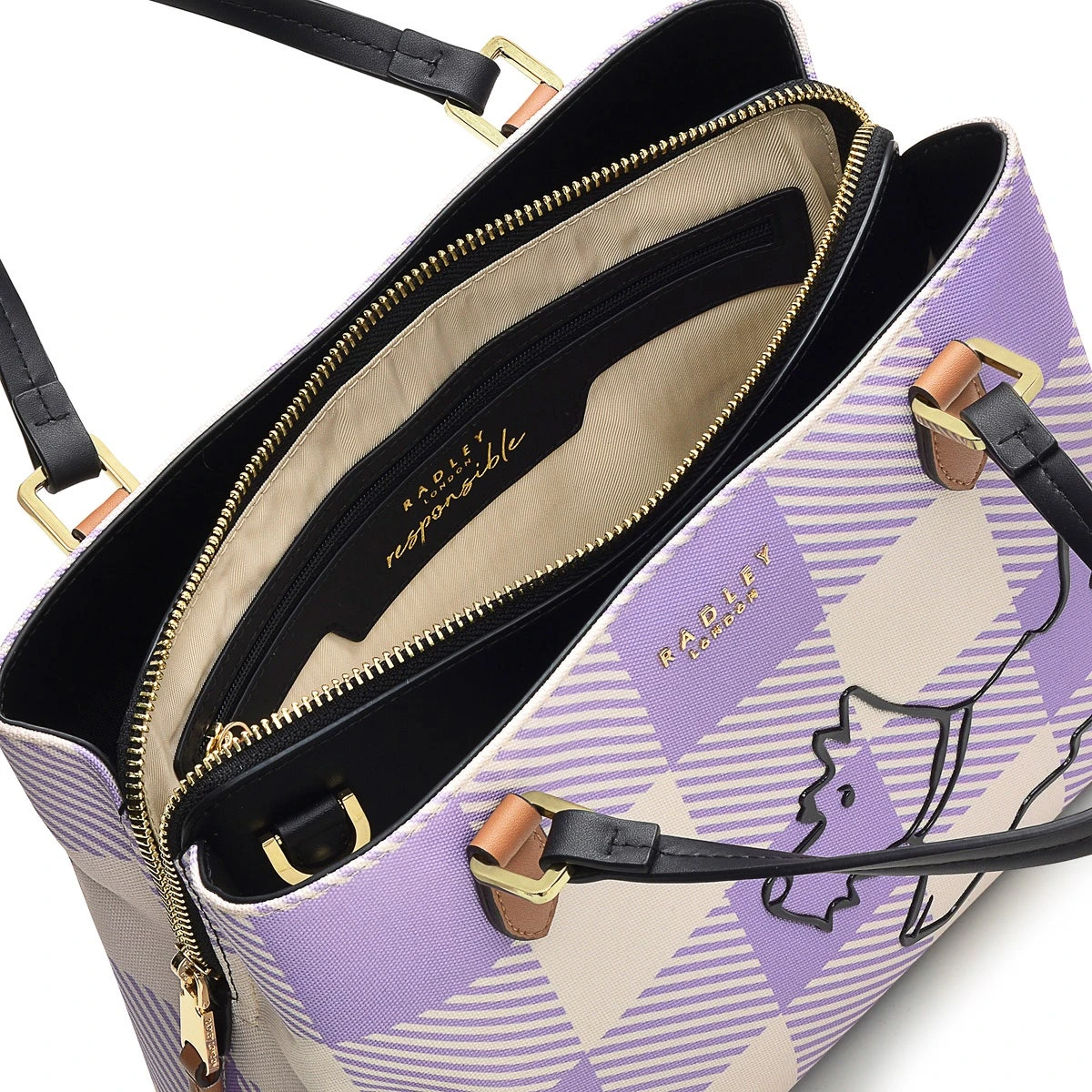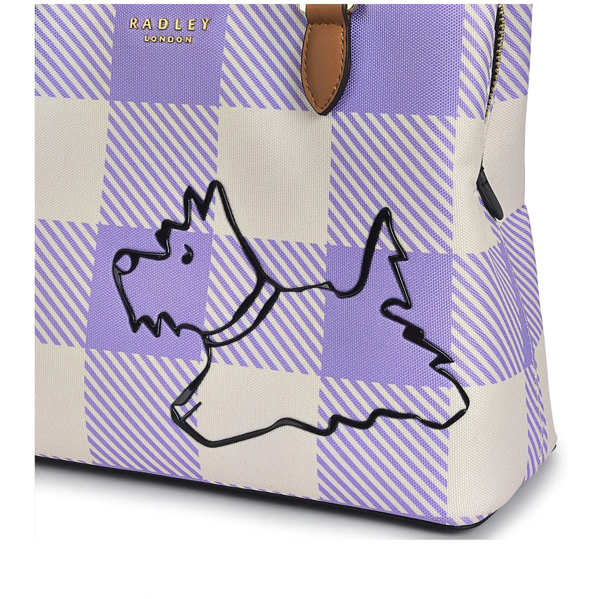 Ready for walkies. Radley dog is the main character on the Palace Gardens bag, with his cheeky silhouette appearing in a raised, rubberised print. Designed in our signature triple-compartment multiway shape, crafted with checked responsible polyester and contrast water-based PU trims.