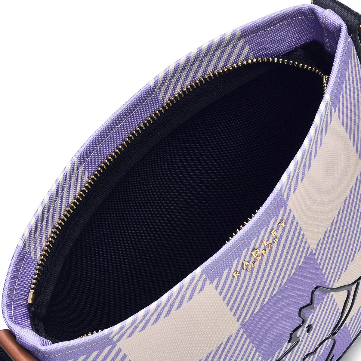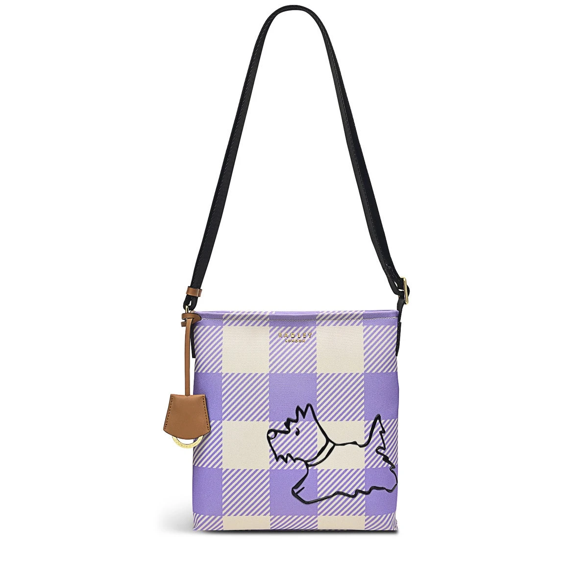 Ready for walkies. Radley dog is the main character on the Palace Gardens bag, with his cheeky silhouette appearing in a raised, rubberised print. The slim shape is inspired by our signature Pockets cross body but swaps the leather for checked responsible polyester and contrast water-based PU trims.