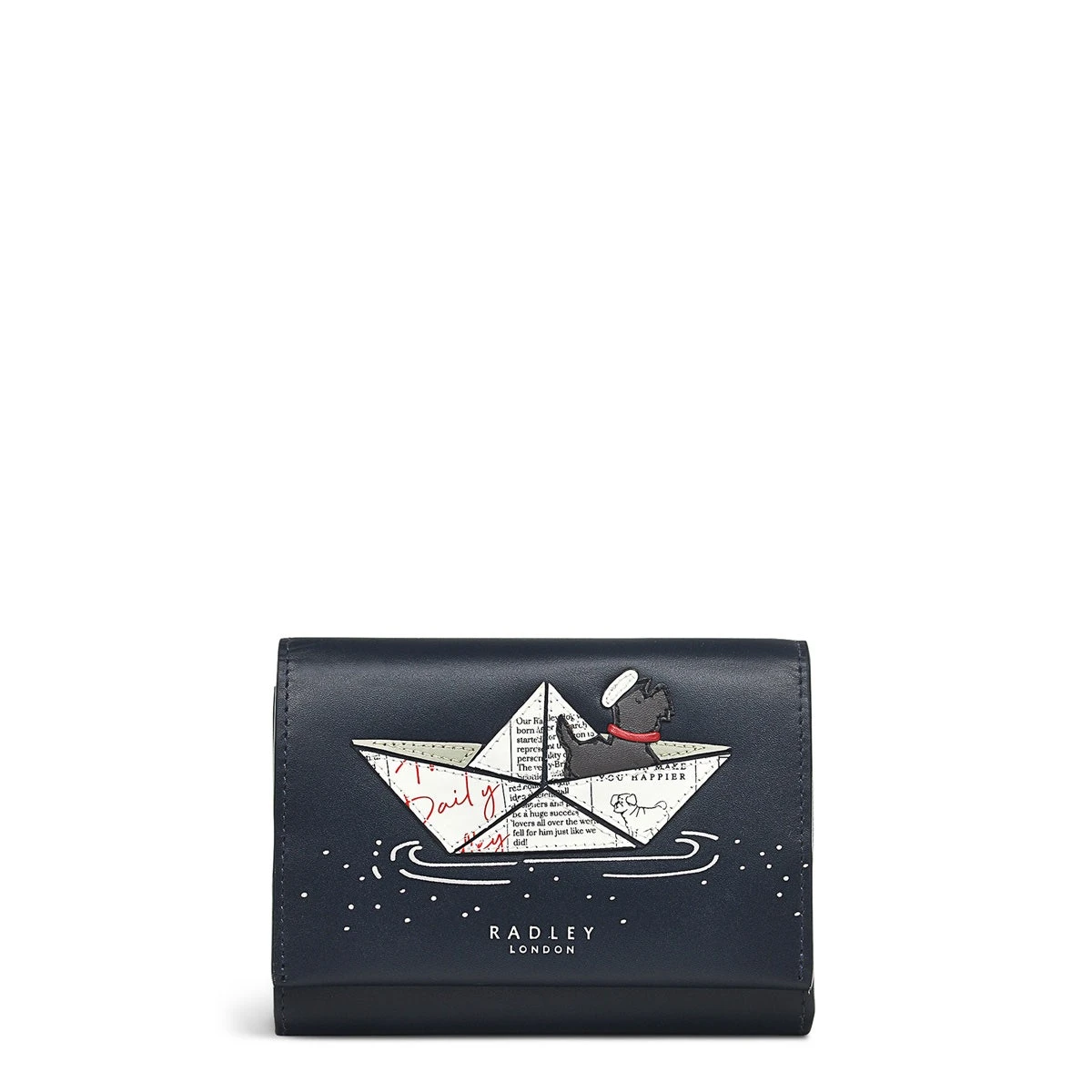 Our Scottie dog is enjoying a new adventure, this time on water. See him floating along in a homemade paper boat on the Sail Away medium purse. Look closely and you’ll see he’s used a page of The Daily Radley newspaper, crafted using leather appliqué and screen prints.