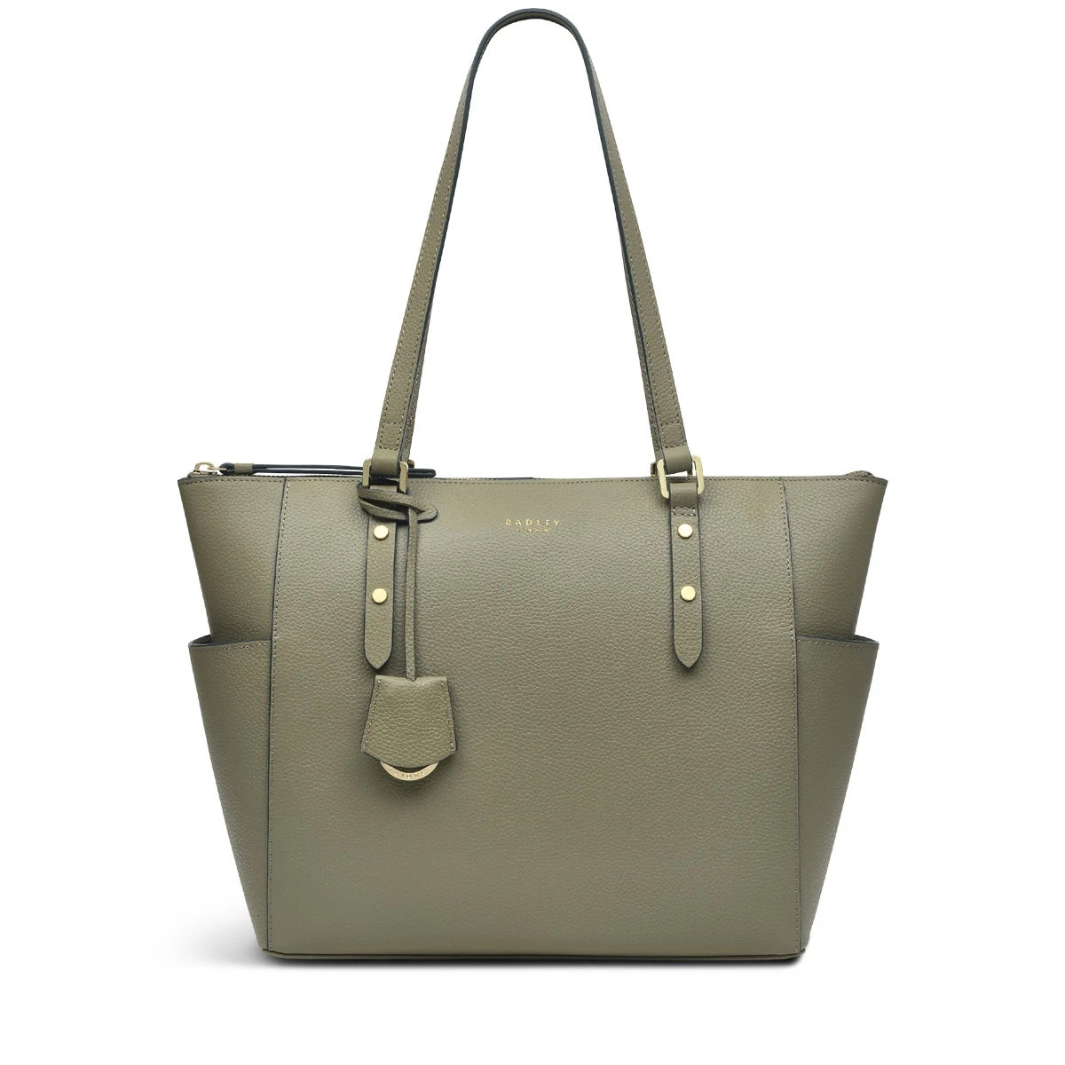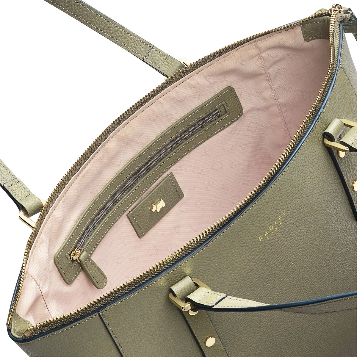 Searching for a timeless tote? We’ve got the answer right here. This is Silk Street. The bag you want on your shoulder when rushing between meetings. Or when heading to a longawaited lunch date. You’ll see where our Designers have put their thoughtful, considered touches. In the contrast painted cut edges and the slim handle tabs with stud hardware. With a spacious interior too, it checks every box: Crafted in grained leather , Painted cut edge detailing , Twin shoulder straps with stud hardware , Slip pockets to sides , Ziptop fastening , Radley Jacquard fabric lining , Interior zip and slip pockets , Foil embossed Radley London logo , Detachable Scottie dog key fob , Comes with a Radley London dust bag
