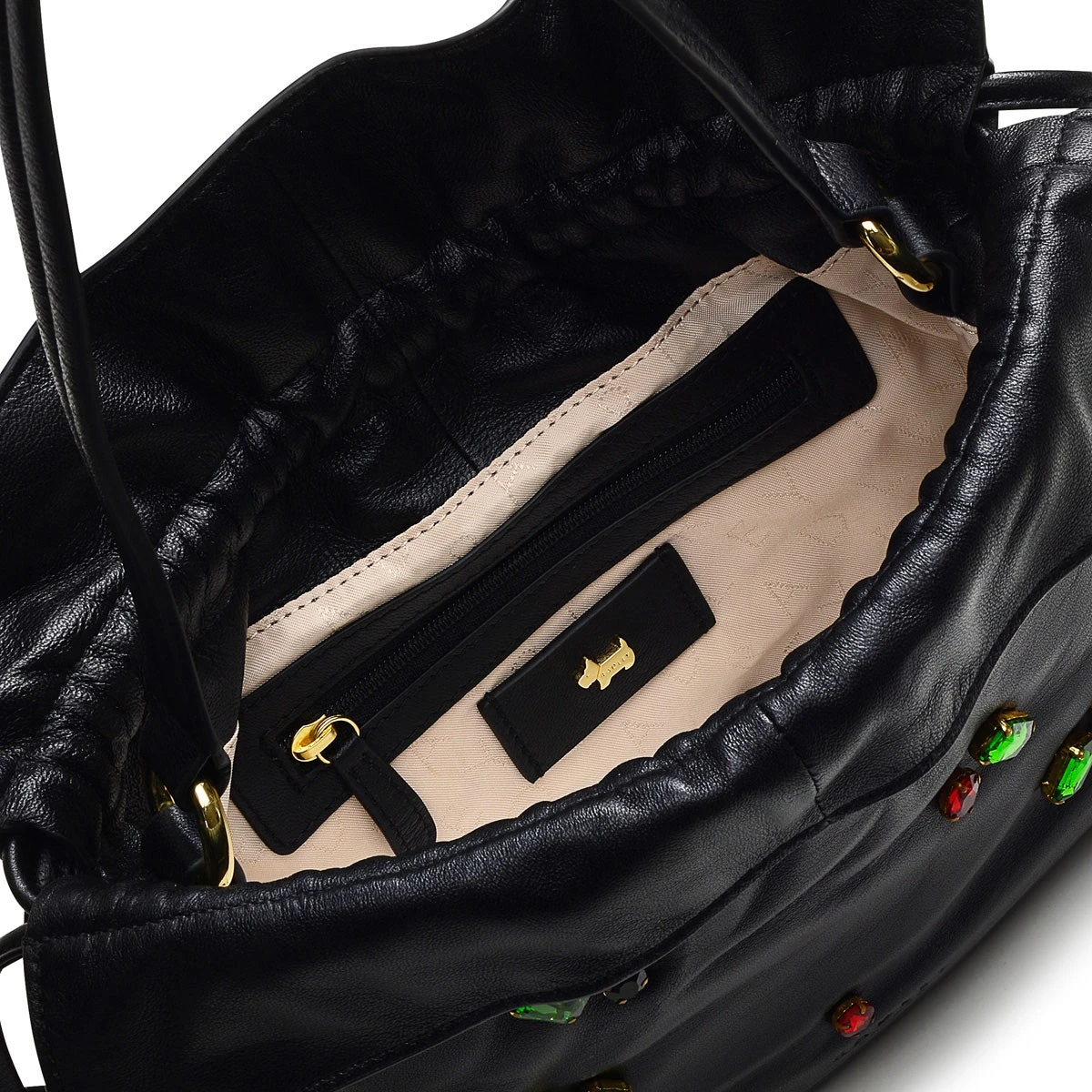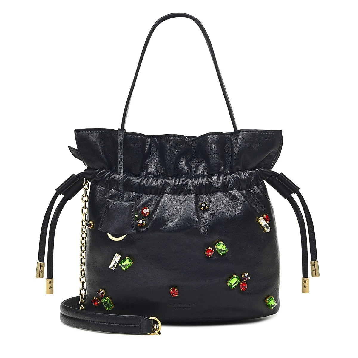 The festive season always means adding extra sparkle. Thats exactly what weve done with our Sunny Rise bag. Its super-soft lamb nappa leather is now adorned with refined, colourful gemstones. Complete with the same padded top handle and chain cross body strap for versatility when styling with your occasion outfits.